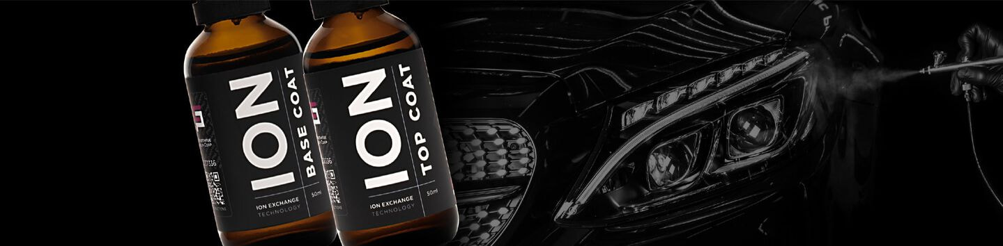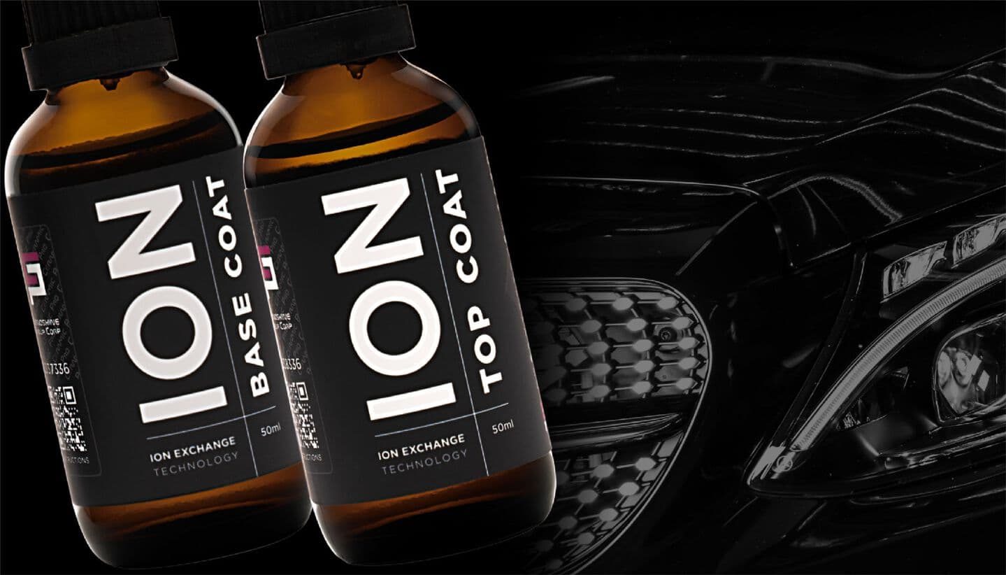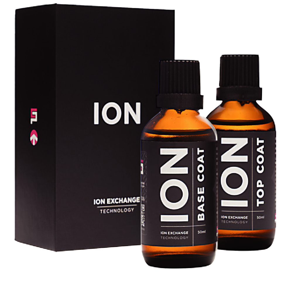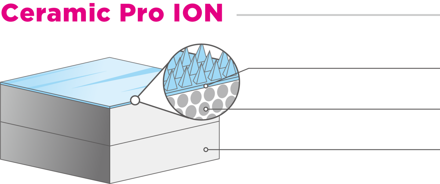 Ceramic Pro IONは、ION BASE COATとION TOP COATの2液が施工されることによって優れた性能を発揮。ION BASE COATで厚みや耐薬品性・耐UV性・耐摩耗性のある保護層を形成。その上にION TOP COATを施工することによってイオン交換反応を活性化し、分子の密度を上げることで性能を強化。優れた防汚性やセルフクリーニング効果、優れた光沢、疎水性を発揮します。