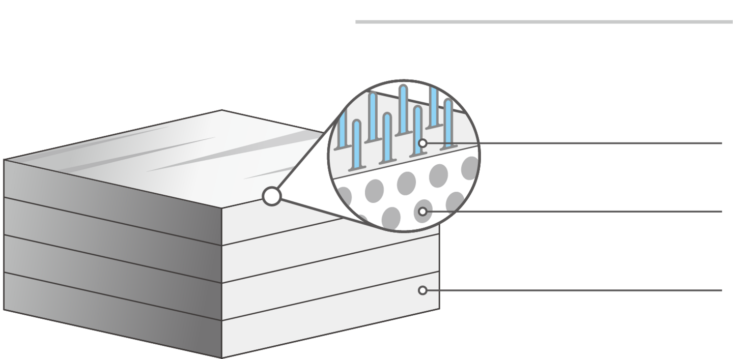 これまでのヘア状の撥水基とは異なり、ピラミッド状の強力な撥水基を備え、より耐久性に優れた疎水性能を持ちます。