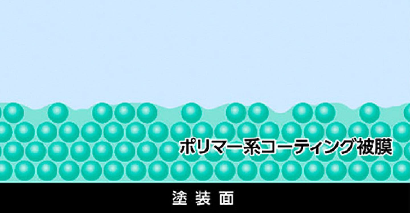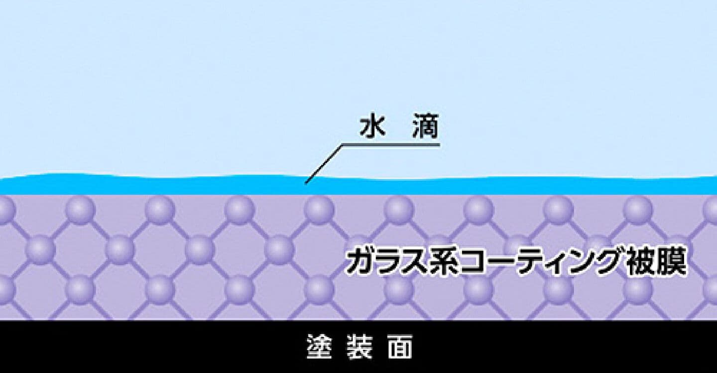 形成されるコーティング被膜は、反応硬化型であり、ポリマー系コーティングに比べ、被膜硬度や耐久性、光沢・ツヤ性能が高くなる。また、ガラスと類似した分子構造となるため、コーティング被膜は親水状態になる。