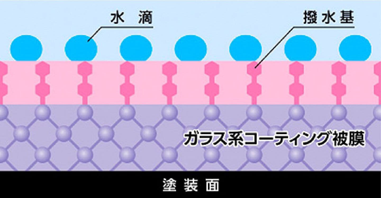 ガラス系コーティングが形成するコーティング被膜は、ガラスと類似した分子構造となり、親水状態になることが一般的です。弊社は長年の研究と独自の技術により、このガラス系コーティングの分子構造内に撥水基の化合物を組み込むことに成功、ガラス系コーティング特有の高い防汚性能を保持しながら、撥水性、耐候性、耐熱性、耐薬品性、光沢・ツヤ効果を実現しました。